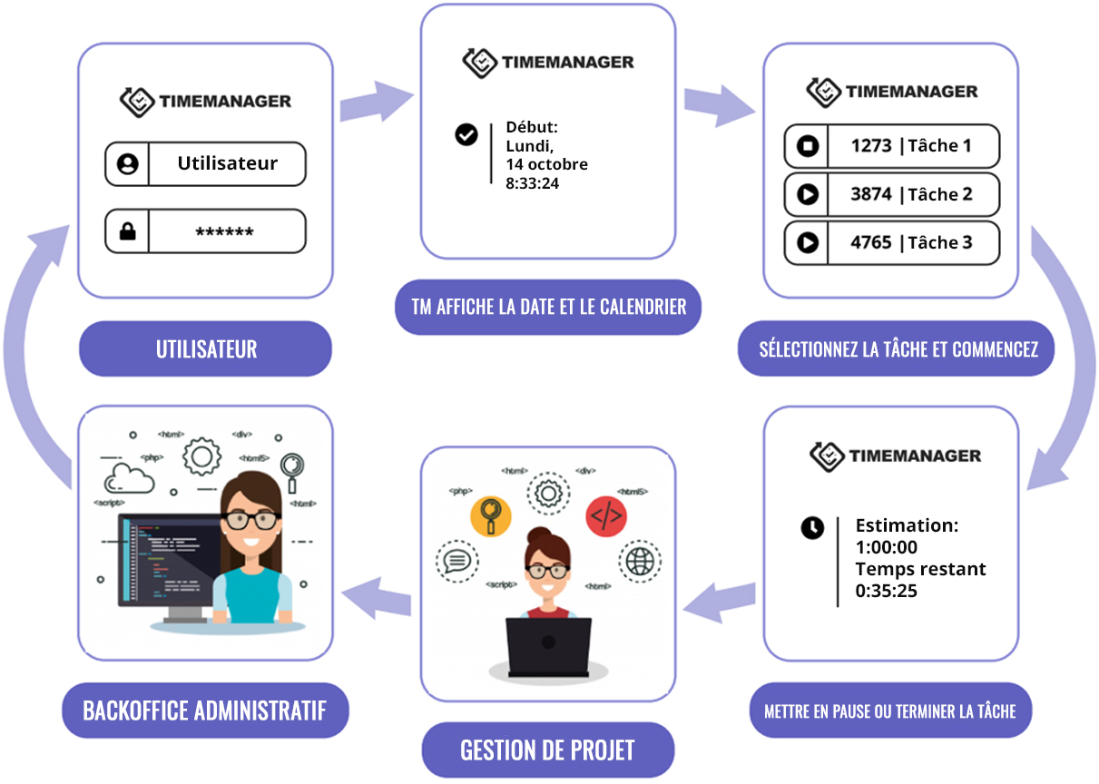 L'outil Time Manager dispose d'un cycle de travail très complet, qui démarre à partir de la connexion (individuelle pour chaque utilisateur) depuis la versión "client" hébergée sur le PC Desktop. Il affiche les dates et heures actuelles à l'utilisateur, permettant ultérieurement à l'utilisateur de sélectionner l'activité à réaliser, en cliquant sur "commencer" sur la tâche à exécuter.